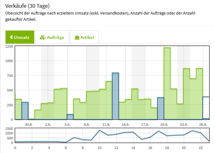 Die Übersicht der Verkäufe der letzten 30 Tage veranschaulicht die Umsatzzahlen, das Auftragsvolumen und die Anzahl der verkauften Artikel. Dabei stellen die blau eingefärbten Bereiche die gleichen Wochentage der Vorwochen dar, um abschätzen zu können, wie sich der heutige Verkauf entwickelt. Für den aktuellen Tag wird der durchschnittliche Wert angezeigt. Dies dient der Abschätzung der Verkaufsentwicklung.